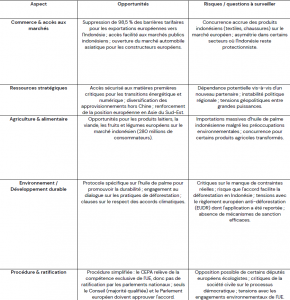 1. Impact environnemental : La principale préoccupation concerne la déforestation en Indonésie, notamment liée à la production d'huile de palme. Les organisations environnementales dénoncent un accord qui pourrait encourager la déforestation, en contradiction avec le règlement européen anti-déforestation (EUDR), dont l'entrée en vigueur a d'ailleurs été reportée d'un an, à fin 2026. Le protocole sur l'huile de palme est jugé insuffisant car il ne contient pas de mécanismes contraignants.
